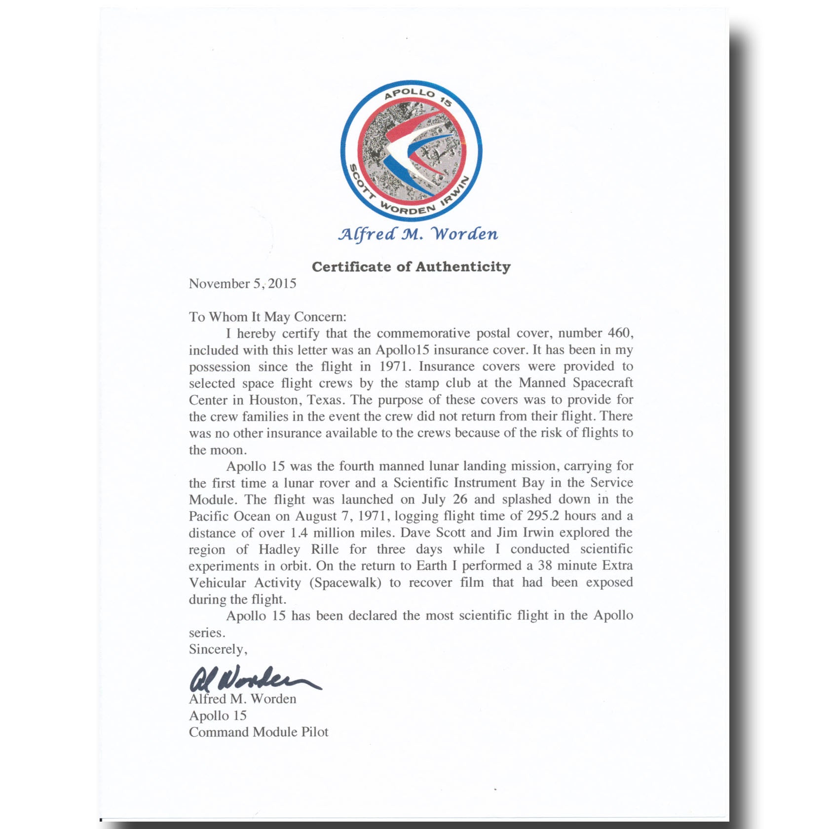 This exceptional artifact is an Apollo 15 insurance cover, originating from the personal collection of Alfred Worden, Command Module Pilot of the mission. The cover is hand-signed by all three Apollo 15 astronauts – Commander Dave Scott, Lunar Module Pilot Jim Irwin, and CMP Al Worden – and bears additional provenance: Worden has both annotated and certified the reverse side of the cover in his own hand. It also includes a separate signed Certificate of Authenticity from Worden.