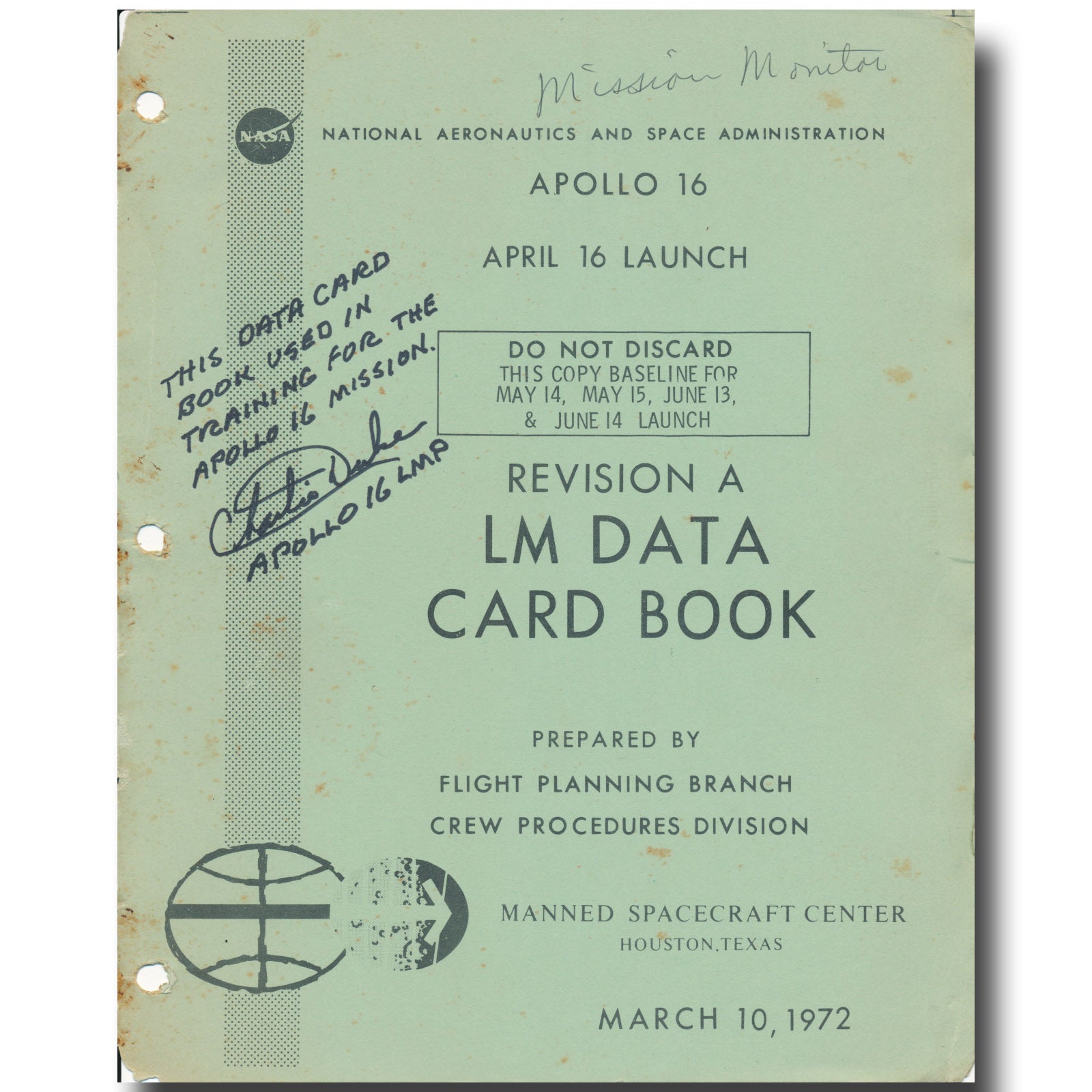Rare 8x10 !! Apollo 16 LM DATA checklist page hand signed and certified by Charlie Duke.